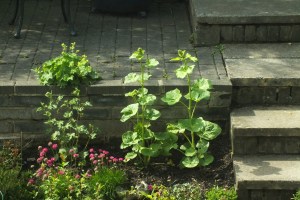 I also decided that the herbs on the fence require too much watering and have reduced my herb growing activities to mint, parsley and coriander, which are in a very large pot further into the shade so they won’t require so much attention. To fill the gap on the fence, I’ve placed a token Geranium in each of my four terracotta semi-circular wall pots in the way I’ve seen done on the walls of houses in Mediterranean countries, in the hope that they’ll survive a bit of neglect.